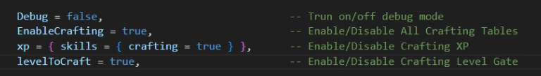 First thing you will find that is pretty important is the first few lines in the config.lua. These will control wether or not you see the debug zones, enable/disable crafting for the server, grant xp or not and if you want to enforce level requirement for crafting.